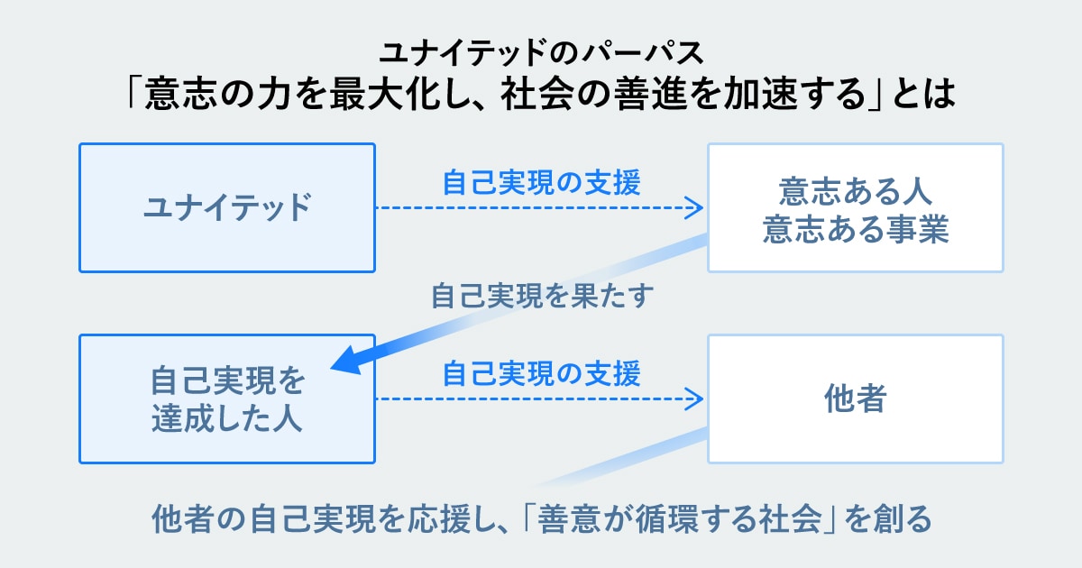 「意志の力」とは、個人や事業に関わる人が自己実現をしようとする推進力のことです。ユナイテッドが「意志ある人」「意志ある事業」の自己実現を支援することで、その個人や事業に関わる人が自信を持ち、満たされる。人は自分が満たされて初めて、他者に目を向けることができますよね。自己実現を達成した人が利他的な想いを持つようになって、次は他者の自己実現を応援できるようになる。そのように「善意が循環する社会」を創りたいという想いをパーパスに込めました。