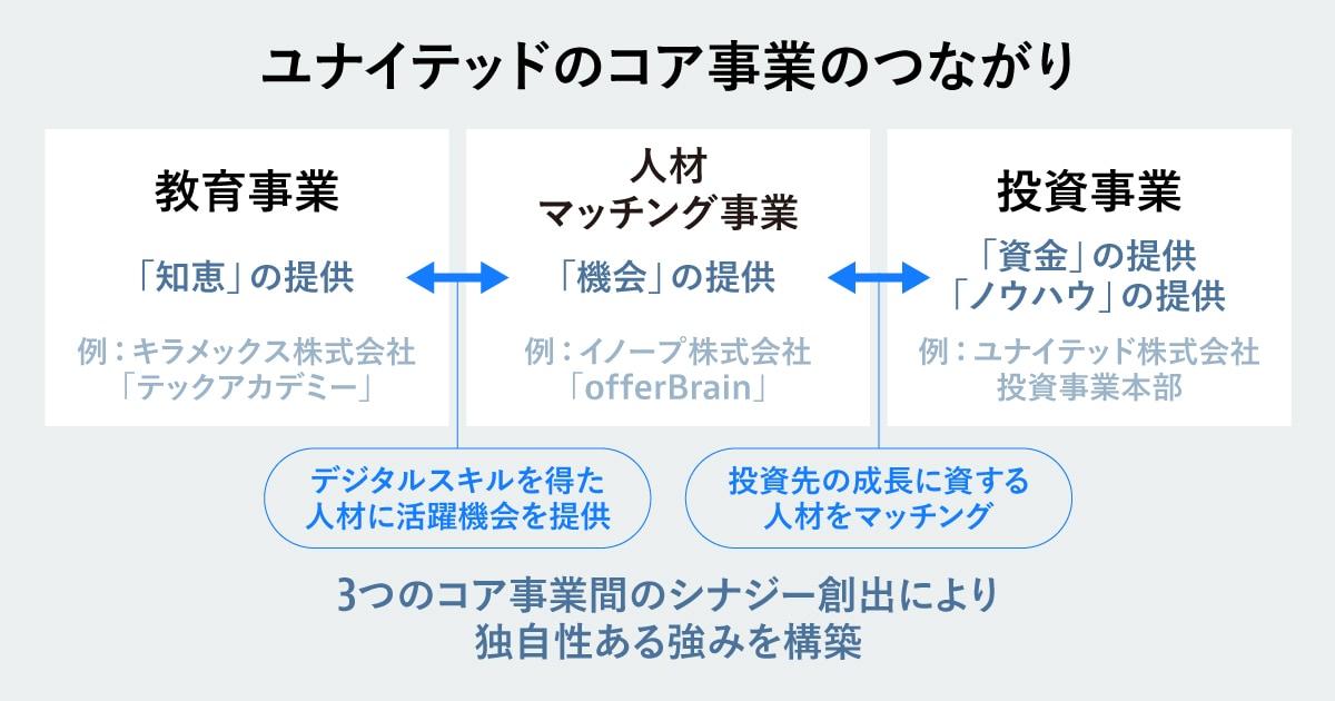 「意志ある人」に、教育事業を通してデジタルスキルという「知恵」を、そして人材マッチング事業で活躍の「機会」を提供します。「意志ある事業」には投資事業で「資金」面からの支援を行うと共に、人材マッチング事業で抱えるプロフェッショナル人材を紹介することや、様々な投資先支援を通じて豊富な「ノウハウ」を提供します。このようにコア事業間での連携を強化し、シナジーを創出することで、ユナイテッド独自の強みを構築することを目指しています。