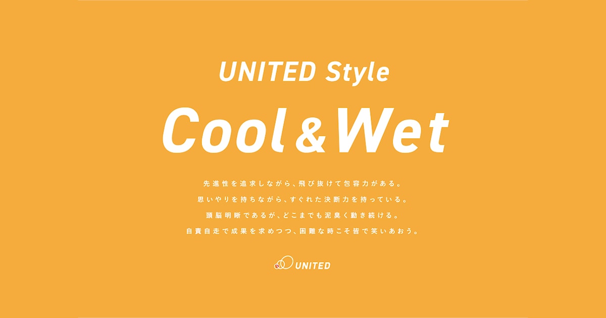 山下:ユナイテッドが組織として大切にしている行動指針は「UNITED Style」として言語化されています。どのような在り方が「UNITED Style」なのかと言えば、「Cool & Wet」であること。「Cool」に先進性を追求しながら、「Wet」な包容力を持つ。「Cool」に結果を出しながらも、苦しい時は「Wet」にお互いを助け合う。一人ひとりがそのような在り方を体現する、またそのような人が集まる組織であり続けたいですね。