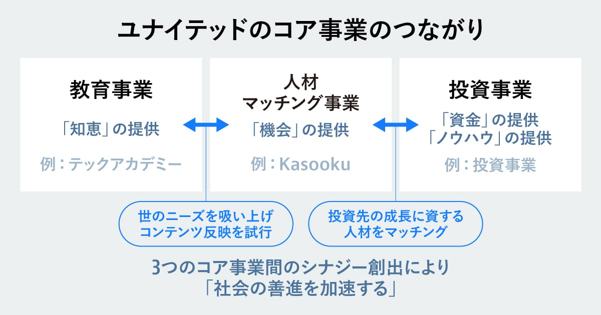 金子:その通りです。そしてこの接続は「人材マッチング事業」→「投資事業」の一方向に限ったものではありません。投資事業と密に連携しながら人材マッチング事業を行うことで、本当に世の中で求められるスキルや能力が何かを蓄積し、その知見を「人材マッチング事業」のサービス開発に落とし込むことで、双方向のシナジーも生まれています。