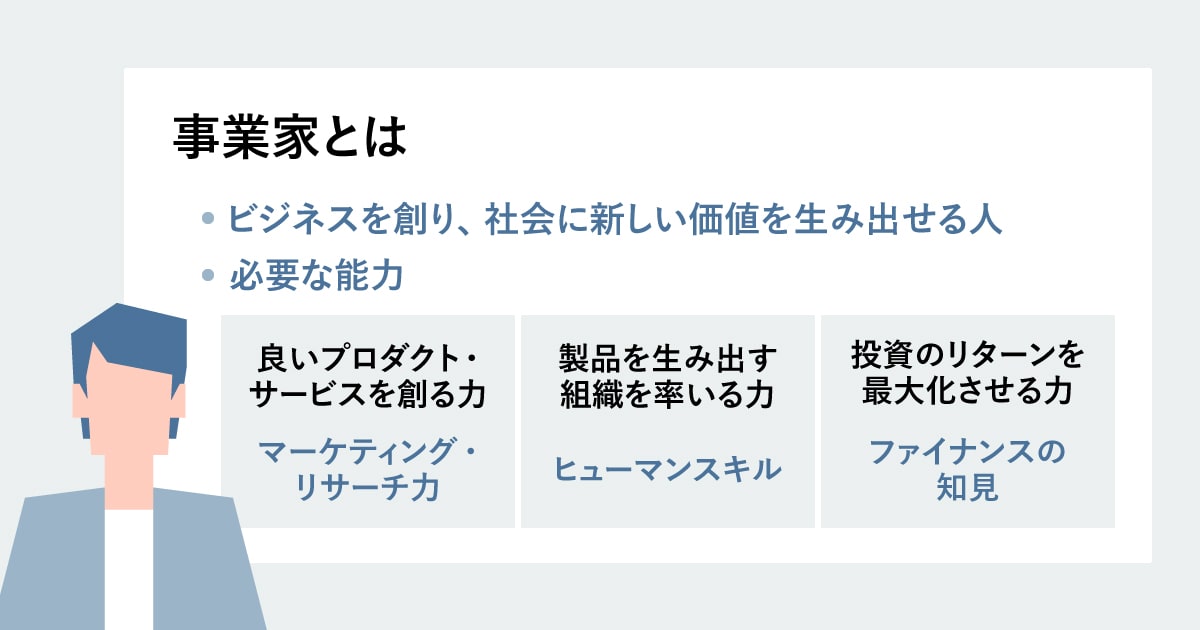 井上:事業家とは、「ビジネスを創り、社会に新しい価値を生み出せる人」のことです。新たな価値を生み出すには、良いプロダクト・サービスを創るマーケティング力やリサーチ力だけなく、その製品を生み出す組織を率いるヒューマンスキル、投資のリターンを最大化させるファイナンスの知見等、多くのビジネススキルを身に付ける必要があります。