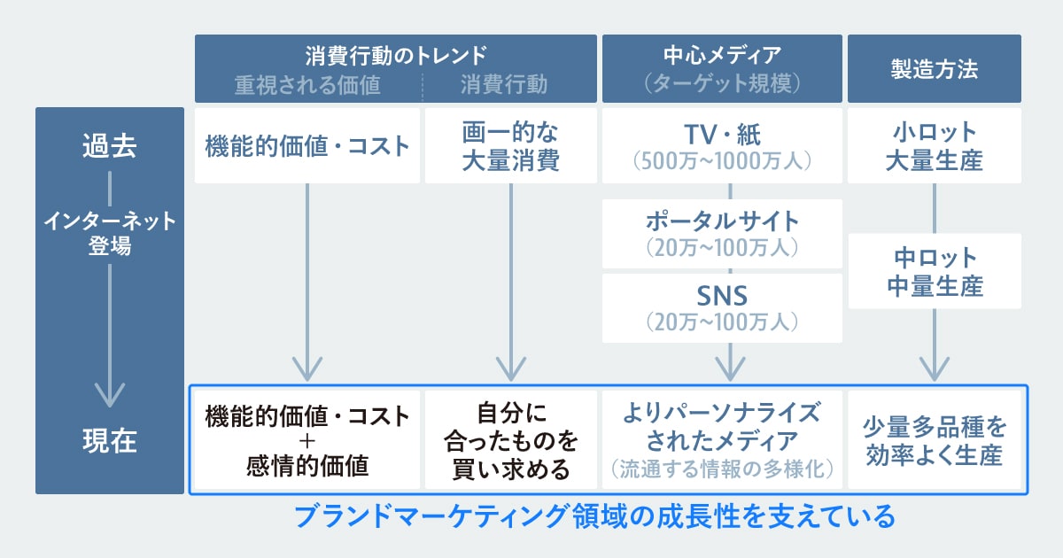 ──成長領域に携わる重要性は理解しつつも、「事業家を目指す学生が飛び込むべき、伸びる領域か否か」を学生が見極めるのは難しいと感じています。「ブランドマーケティング」は学生には馴染みが薄い領域ですが、なぜ成長しているのでしょうか?