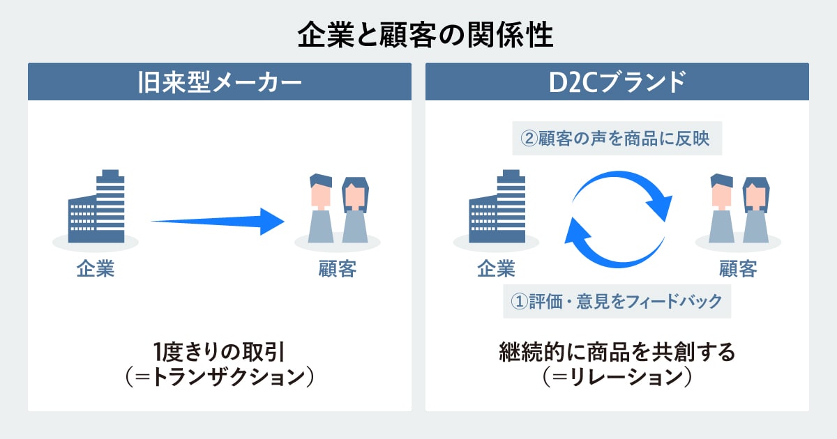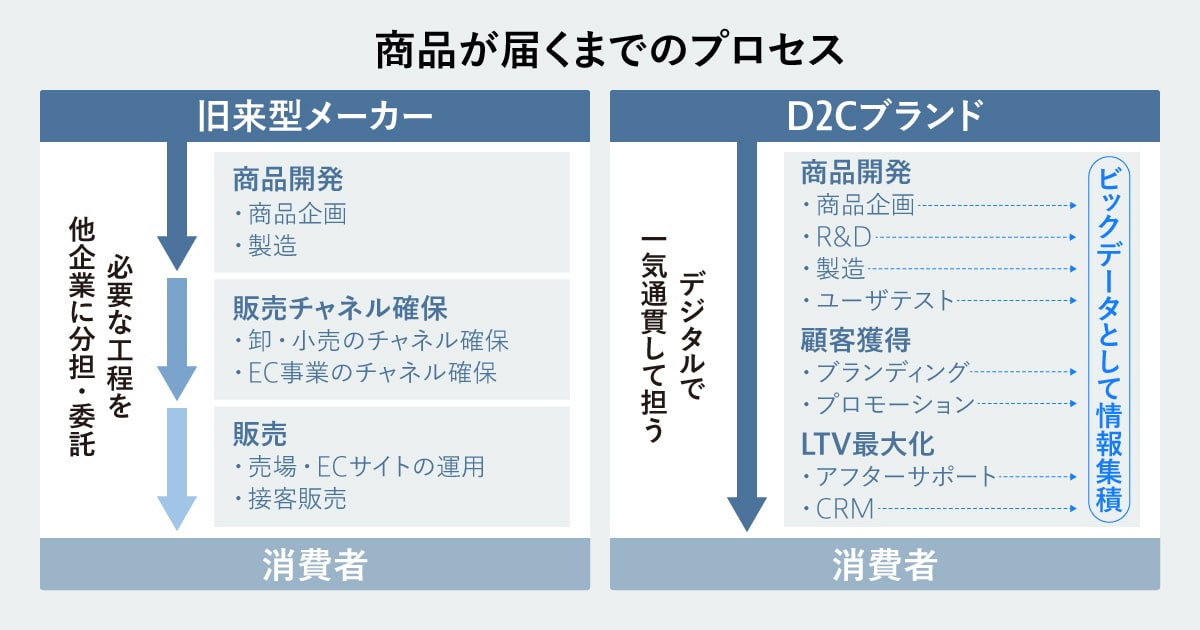 中上:当社はD2C事業で、「ブランドマーケティングのDX」を実践しています。D2CとはDirect to Consumerの略で、直訳すると「自ら企画、生産した商品を広告代理店や小売店を挟まず、消費者にダイレクトに販売する手法」です。デジタルを用いることで、製造からプロモーション、アフターサポートまでを生産者が一気通貫で担い、全バリューチェーンにおいてお客様との接点を保つことができます。