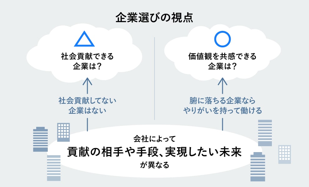 森田:就活生からよく聞くのが「社会貢献がしたい」という言葉です。しかし、社会貢献をしていない会社はありません。どの会社も世の中に対して何らかの形で貢献をしているはずです。では、それぞれの違いは何なのでしょうか。それは、その会社が貢献する相手や手段、実現したい未来です。そこに自分が共感できるかどうかが、やりがいを持って働くためにはとても重要だと思います。