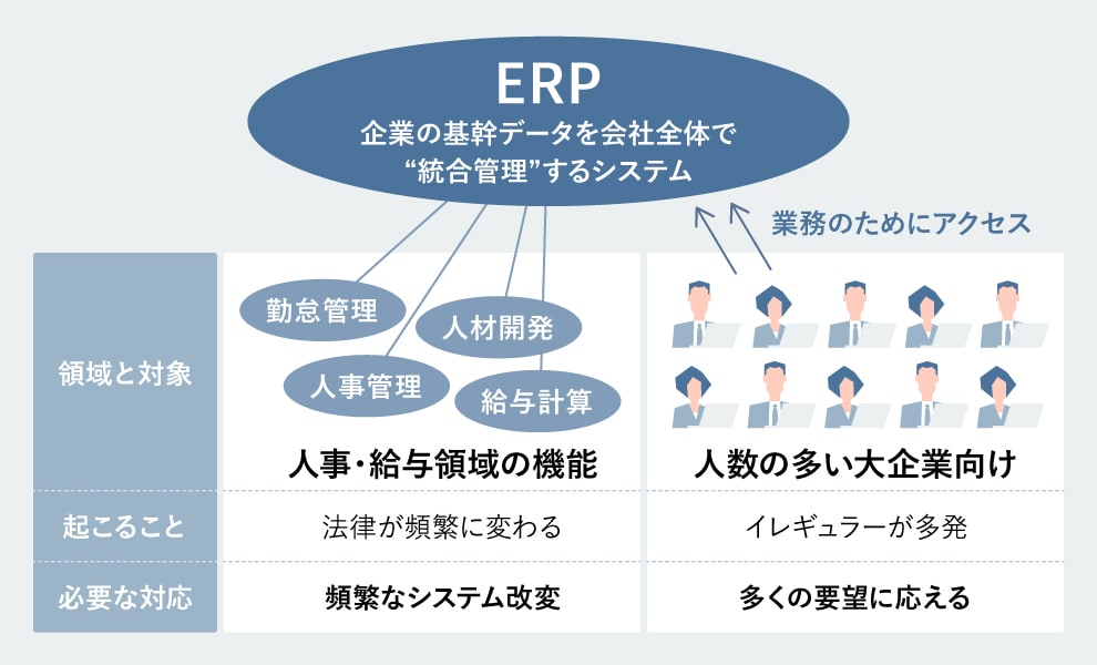 HR領域では毎年のように法改正があるうえ、当社のお客様である大企業は人数が多いことから、細かなイレギュラーが多数発生します。したがってERPは「頻繁なシステムの改変やあらゆる細かい要望や変化に、どれだけ迅速に応えられるか」が、価値提供の肝になります。当社の製品「COMPANY」の強みは、独自のコンセプトを基軸に、環境変化への適応力に非常に優れていることにあります。