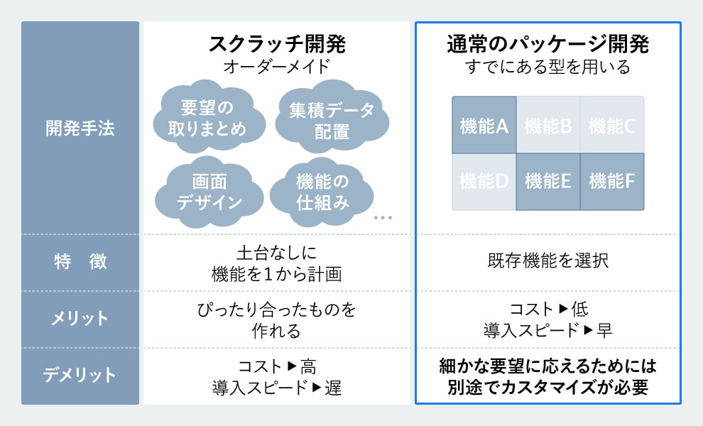 スクラッチ開発では、その会社にピッタリ合うものを作ることができる反面、大規模なシステムだと数千万~億単位での莫大なコスト、数年スパンでの開発時間がかかります。一方でパッケージ開発のシステムは、すでにある型を用いて機能を提供するためコストが抑えられ、比較的すぐに安価で導入できるのが強みです。