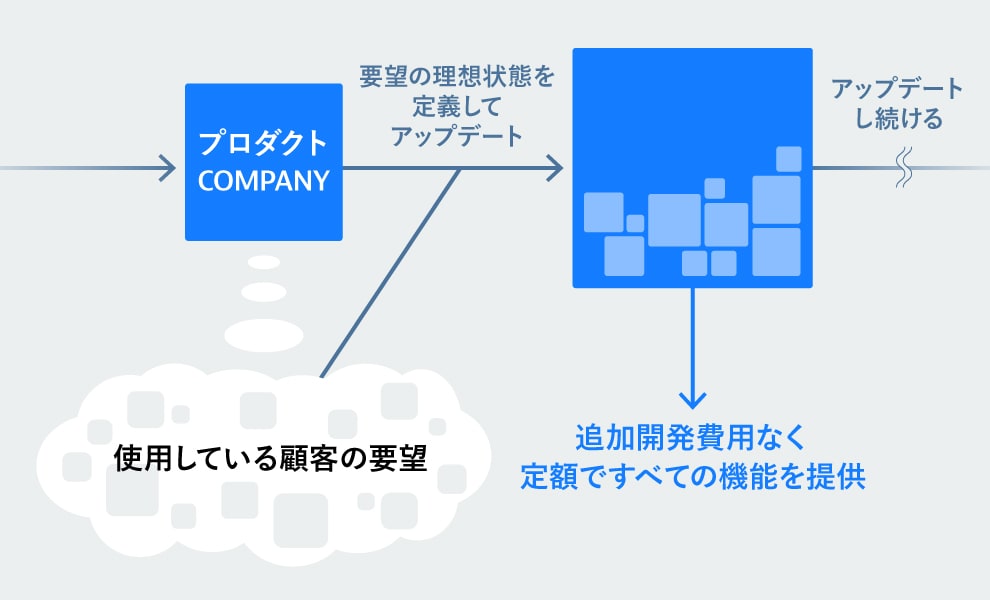 「COMPANY」の開発手法はそれとは違い、お客様の要望をそのまま開発する、というものではありません。「その要望がある業務は、そもそもどのような状態が理想なのか?」を自ら定義し、それを実現するため、要望があったお客様のシステムだけではなく、プロダクトそのものの機能をアップデートする手法を採っています。「COMPANY」は長年にわたり1,100社以上のお客様に導入いただいているため、大概のイレギュラーなどの要望はパッケージに既に組み込まれています。したがって、お客様は「ノーカスタマイズ」かつ追加費用の必要なくそのまま使うことが可能なのです。20年以上の蓄積があってこその“全部入り”とも言えるシステムが既に出来上がっていて、それを提供するというビジネスモデルは、新規参入の競合には中々真似できない戦略だと思います。
