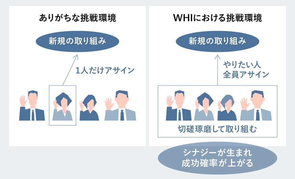 また、営業業務の自由度の高さも特出していますね。一般的な営業においては、言われたことをきちっとやる、といったことが特に入社直後は求められるのではないかと思いますが、WHIでは全く異なります。