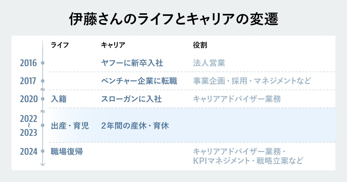 伊藤:現在、キャリアアドバイザー(CA)をやりながら、チームのKPI(重要業績評価指標)マネジメントや、目標達成に向けた戦略立案を担っており、過去の責任者の経験が大きく活きていると実感しています。また、前職での経験があったからこそ、産休育休後にKPIの責任を担う今のポジションを任せていただけたのではないかとも感じています。
