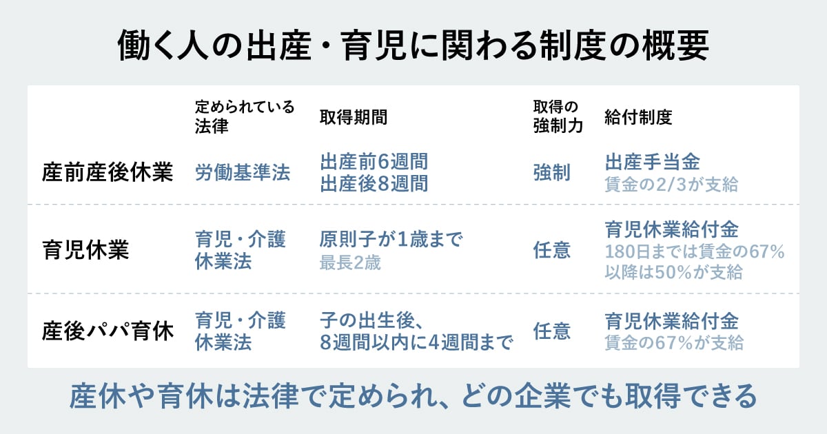 大手企業の方が福利厚生がよく整備され、ベンチャーだから整備されていないということは一概には言えません。それに加え、産休・育休などの制度は法律で定められているため、どの会社でも最低限は必ず整備されているはずです。むしろ、規模の小さい会社だからこそ個人に配慮しやすかったり、社員一人ひとりの必要性が重いがゆえに、柔軟に話し合いの場を設けてくれたりすることもあるでしょう。