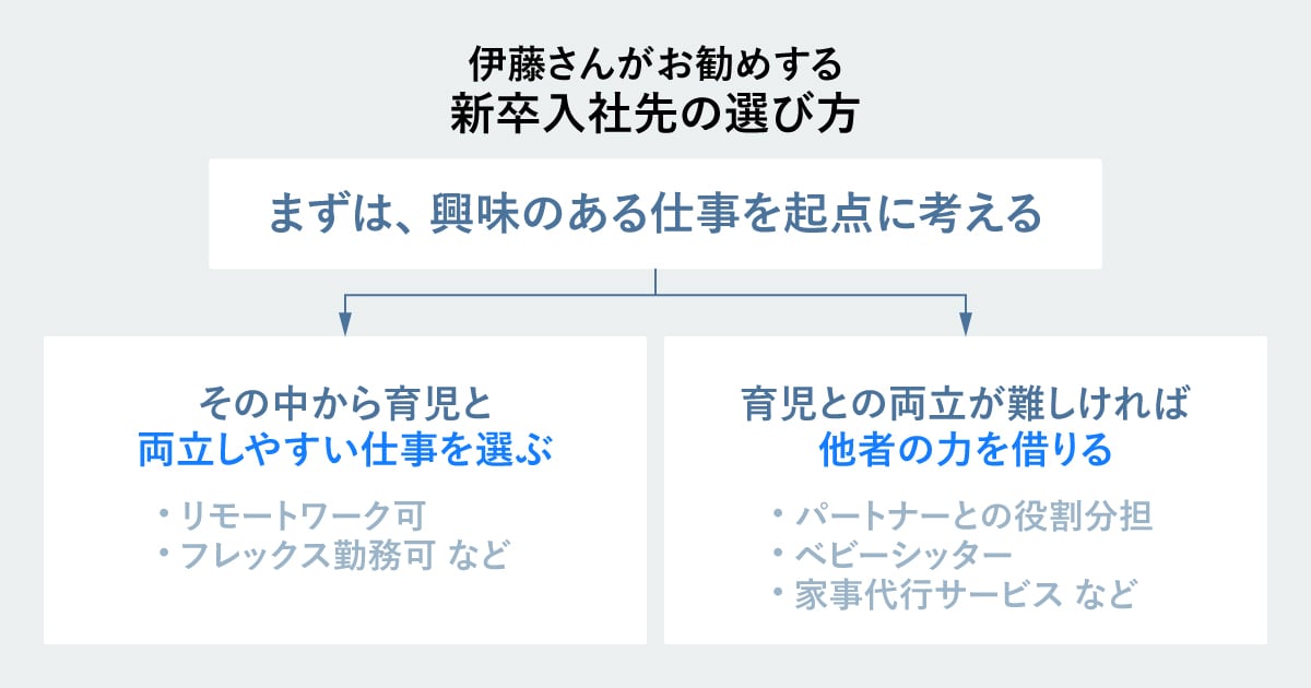 伊藤:新卒時からキャリアプランを変更すべきかというと、それは十分な検討が必要だと思います。ライフプランを優先して自分が本当はやりたくはない仕事に就いてしまうと、人生の中で一定の割合を占める仕事の時間がただ不幸せな時間になってしまい、ライフプランも立ち行かないということになりかねません。まずは興味のある仕事を起点に考えましょう。